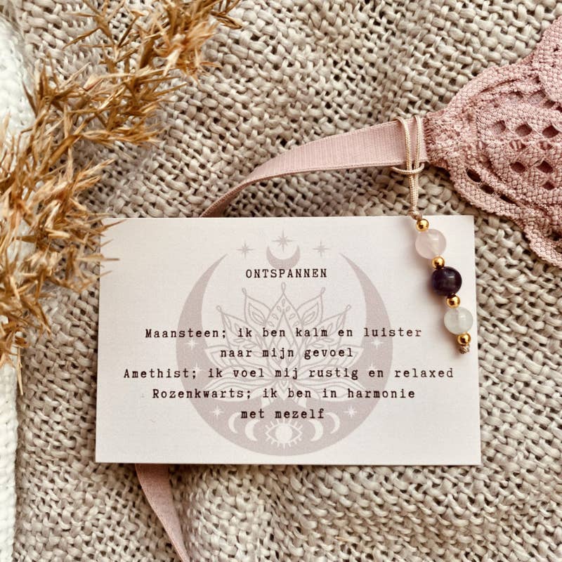 Bevat drie verschillende edelstenen; Maansteen, Amethist en Rozenkwarts. Deze geven rust, kalmte en liefde.