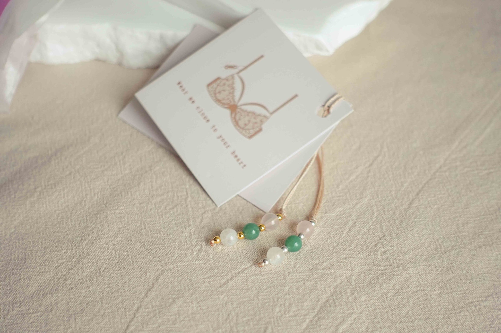 Bevat drie verschillende edelstenen; Rozenkwarts, Aventurijn en Maansteen. Deze geven vertrouwen, kalmte en liefde.
